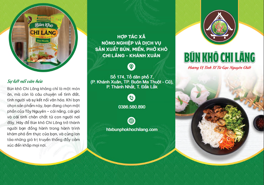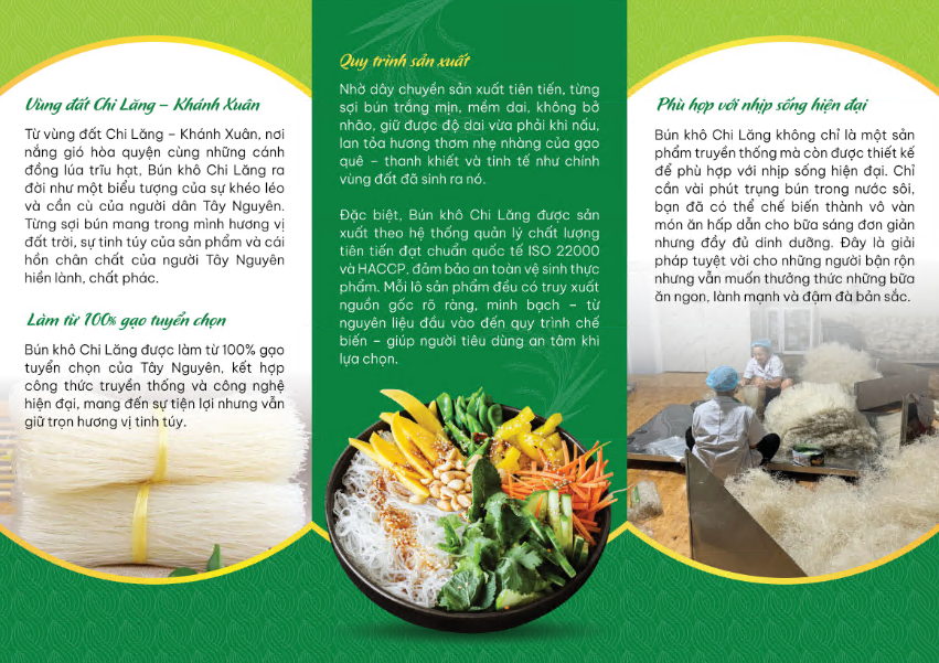 Từ vùng đất Chi Lăng – Khánh Xuân, nơi nắng gió hòa quyện cùng những cánh đồng lúa trĩu hạt, Bún khô Chi Lăng ra đời như một biểu tượng của sự khéo léo và cần cù của người dân Tây Nguyên. Từng sợi bún mang trong mình hương vị đất trời, sự tinh túy của sản phẩm và cái hồn chân chất của người Tây Nguyên hiền lành, chất phác.